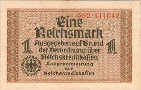 С первых дней образования рейхскомиссариата, немецкие власти столкнулись с большими экономическими трудностями, вызванными нарушением товарно-денежных отношений. Немецкие оккупационные марки имперских кредитных касс «Reihkreditkassenscheine» (RKKS), которые в малом количестве были завезены частями вермахта на захваченную территорию не могли создать необходимую доя повседневных расчетов денежную массу. Для справки отметим, что билеты имперских кредитных касс впервые стали применяться немцами после оккупации Польши в 1939 г. Они печатались в берлинской государственной типографии «Reichsdrukerei» и выходили шестью номиналами: 1/2, 1 (рис. 1), 2, 5, 20 и 50 марок.