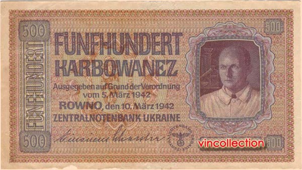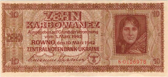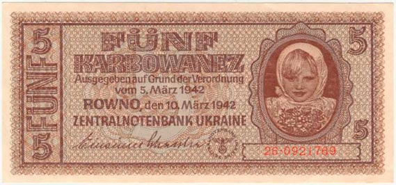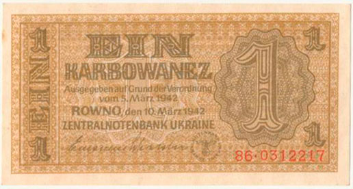 На обширной оккупированной территории у людей на руках оставались советские рубли (рис. 2) и червонцы с серпами, молотами и портретами Ленина, но что с ними делать - никто не знал. Вскоре оккупанты были вынуждены дать разрешение на обращение советских денег, так как создать достаточную денежную массу они пока не могли. Ситуация с платежными средствами упорядочилась только к лету 1942 г. 1 июля 1942 г. Центральным эмиссионным банком Украины (Ровно) были выпущены в обращение первые оккупационные деньги - карбованцы. Новая валюта была названа в память о денежной единице, ходившей в Украинской народной республике в 1918-1919 гг. По мнению немецких властей, это должно было подчеркнуть «самостоятельность» Украины. В берлинской типографии «Reichsdrukerei» напечатали банкноты восьми номиналов: 1 (рис. 3), 5 (рис. 4), 10 (рис. 5), 20, 50, 100, 200 и 500 (рис. 6) карбованцев. Дизайн новой валюты немецкие художники посвятили теме «счастливое украинское население».